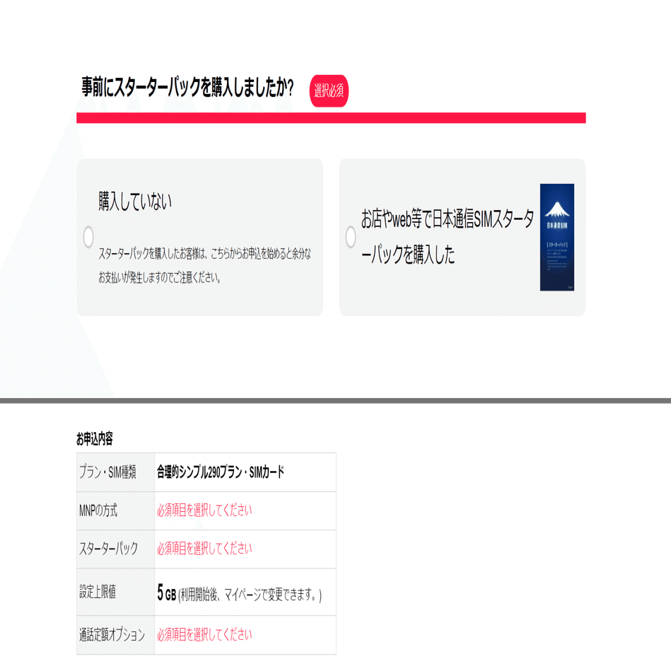 • MNPやデータ上限選択(スターターパックはこの時入力)