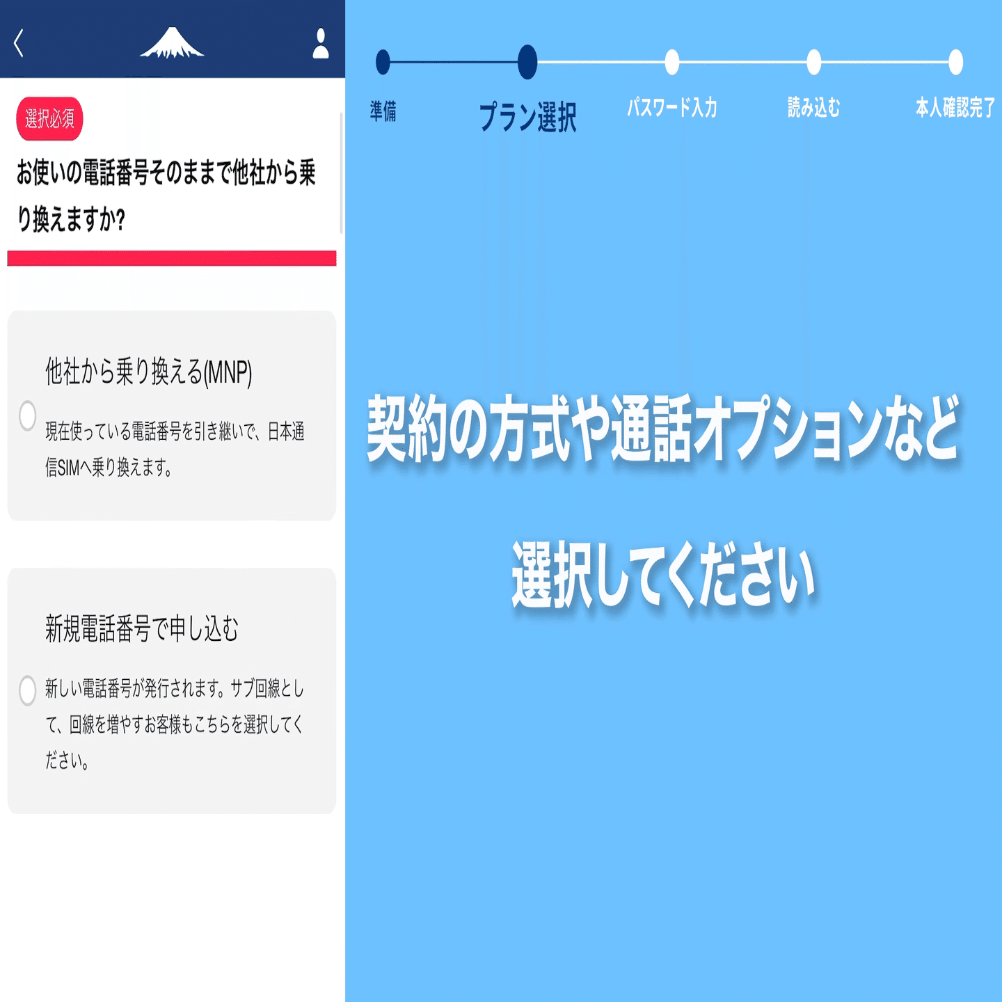 まずMNPか新規かを選びます。乗り換えの場合は従来のMNPかMNPワンストップか選ぶことに。