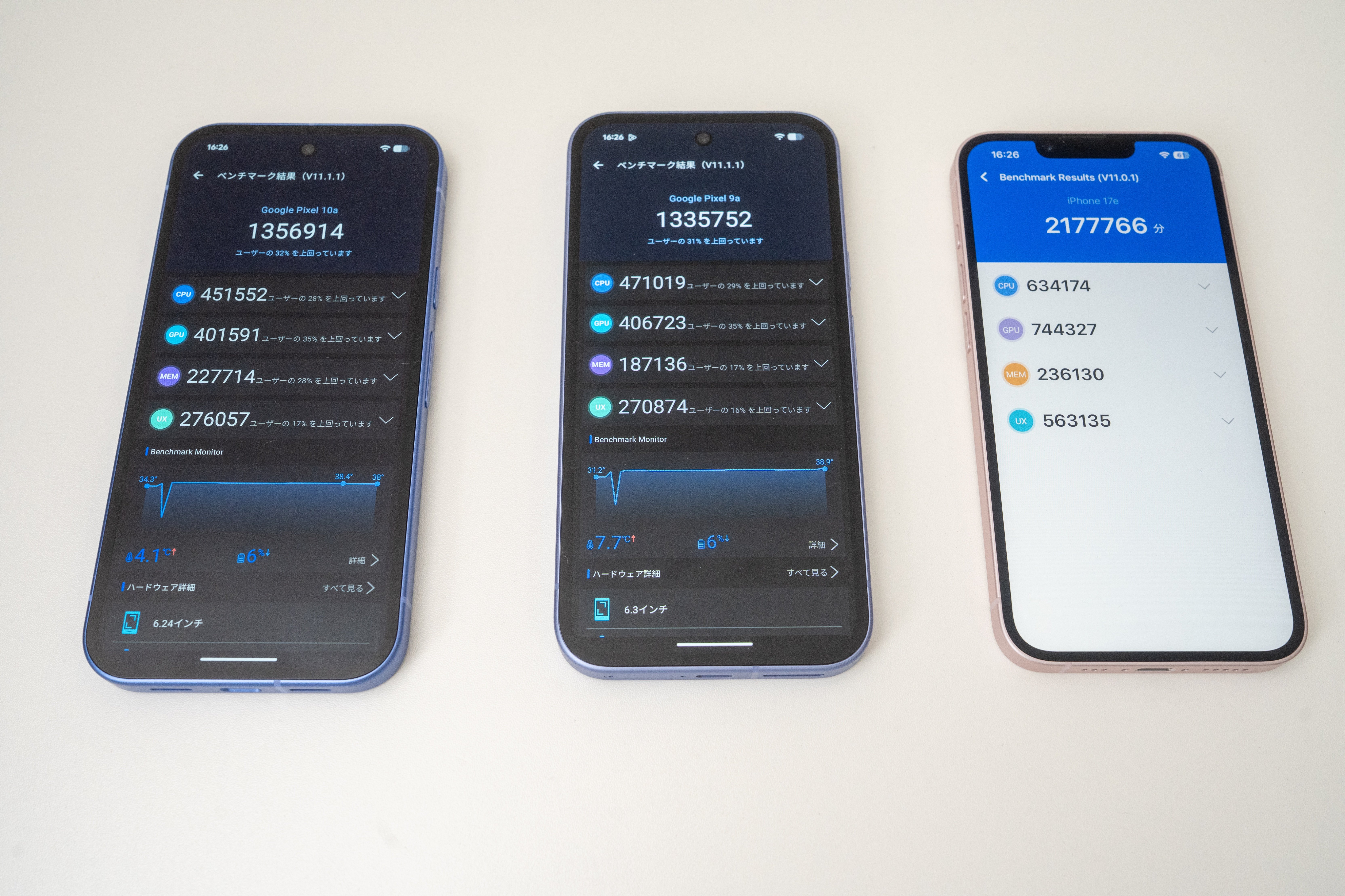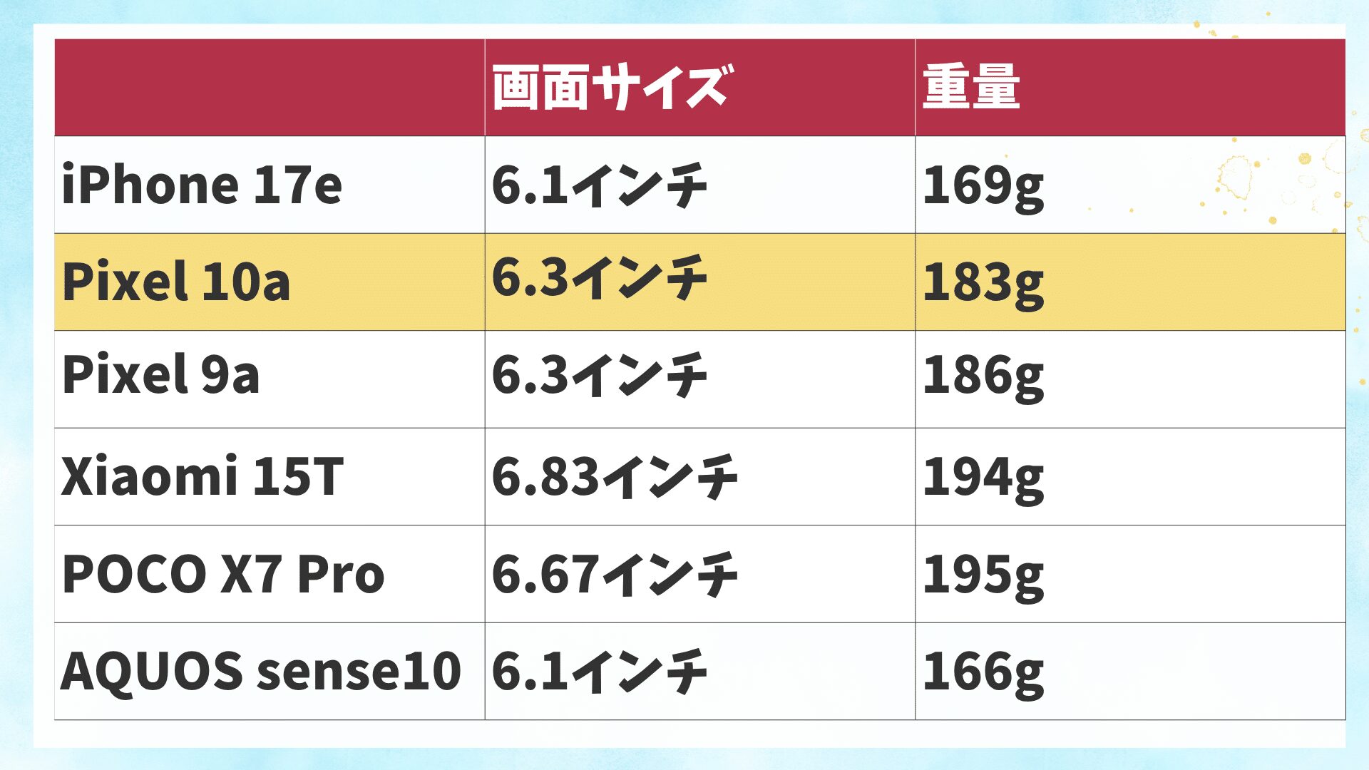 どっちとも言えない点として、画面サイズが挙げられます。Pixel10aは6.3インチ。少し大きいです。17eは6.1。