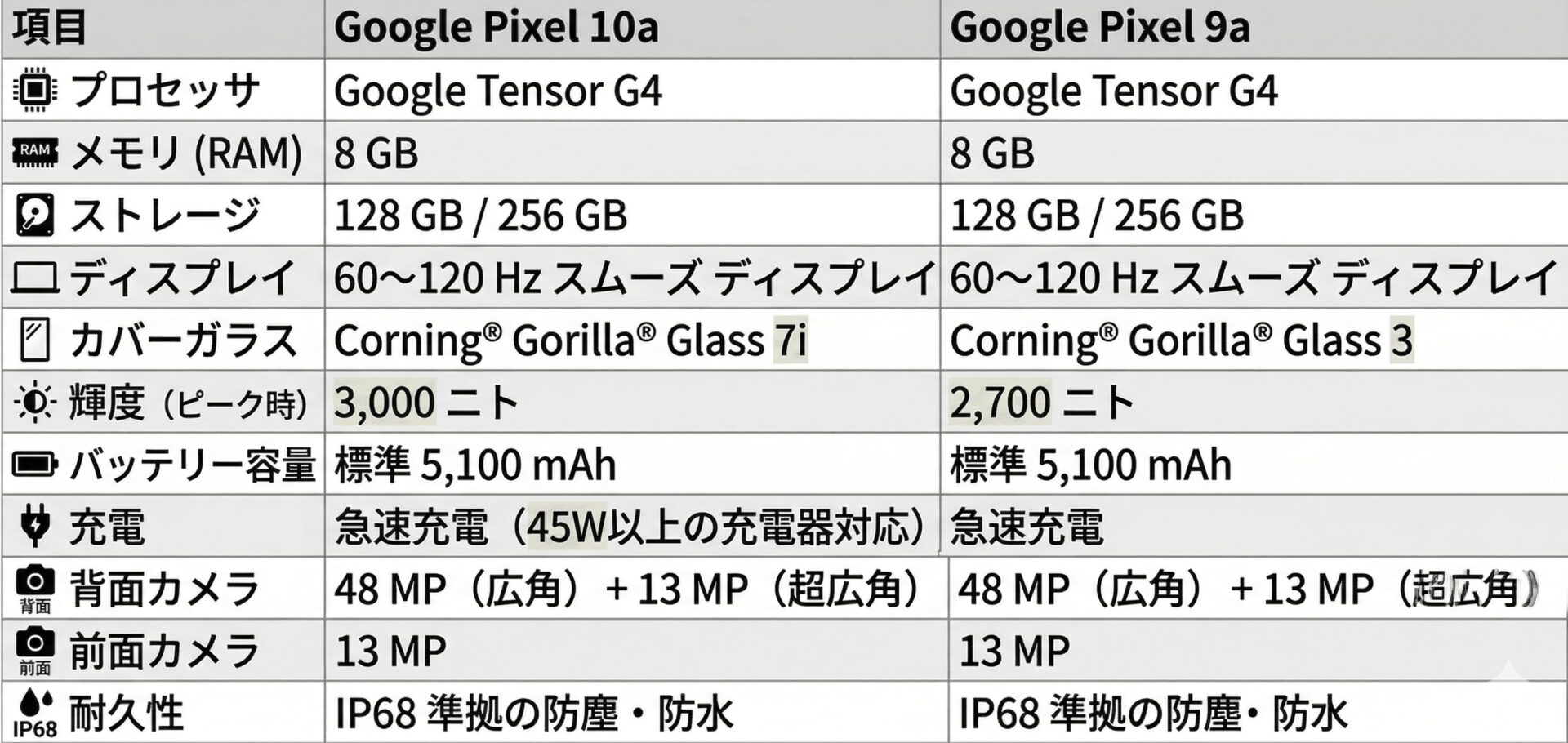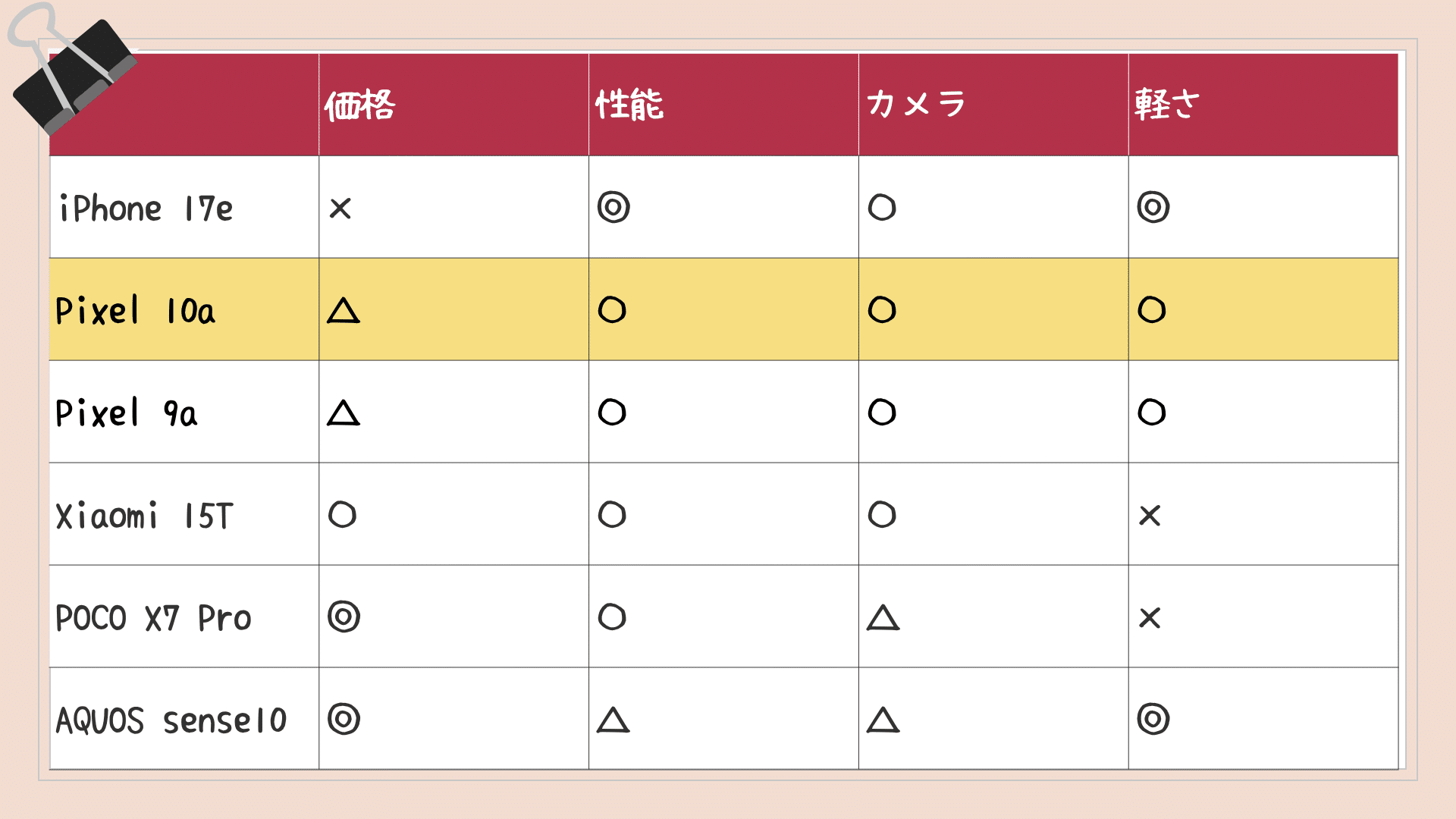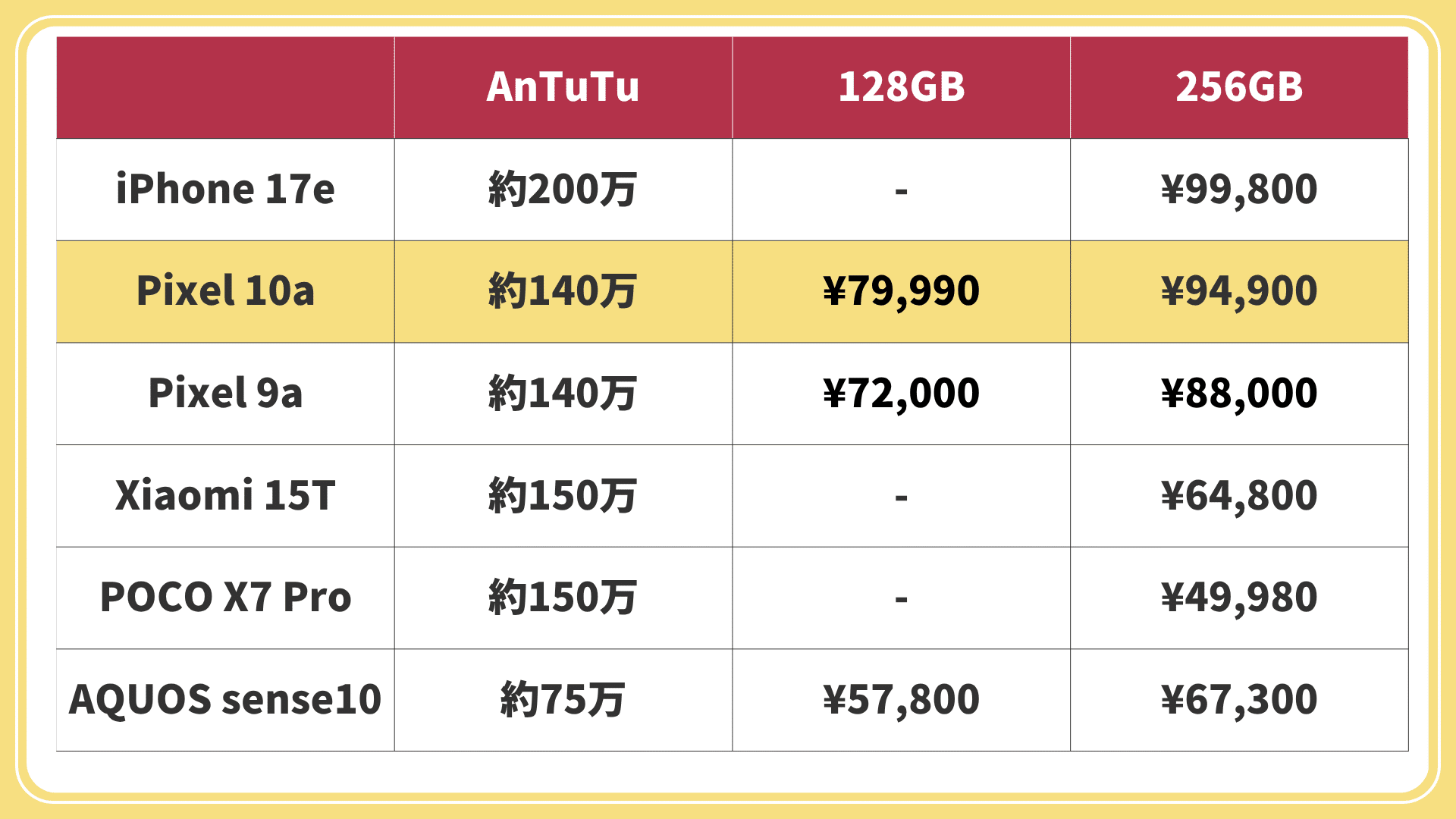 Pixel10aが出ました。毎年最も売れるAndroidスマホの一つですが、今回はどうなのか。他のミドルスマホと比較していきましょう。