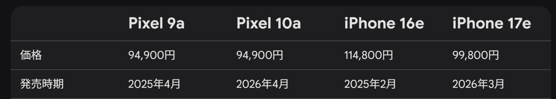 今年は17eが256GBで10万と事実上値下げしたし、Pixelaのコスパ神話は崩されかけています。