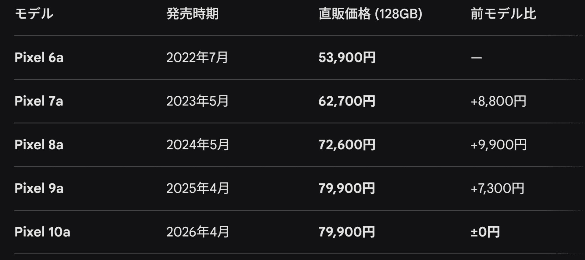Pixel aはiPhoneを買えない層が乗り換えるための入り口でした。無印が12、3万円するiPhone無印は、もはや一般層が買うスマホじゃありません。