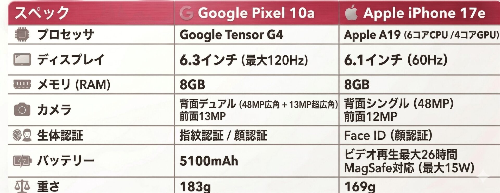 一方iPhone17eはMagsafe対応、169gと軽くてチップの性能が高いこと。