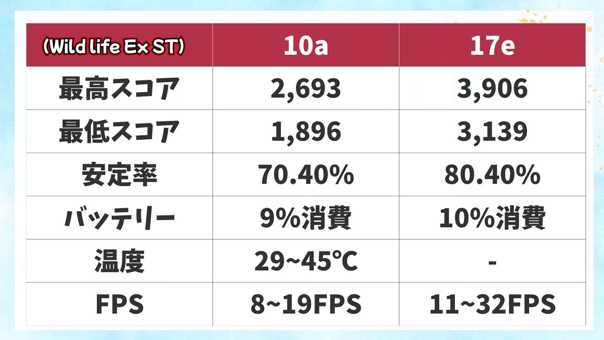 ただし比較対象にならないわけでもなく、軽さとチップは17e。カメラとリフレッシュレートで10aに軍配が上がります。
